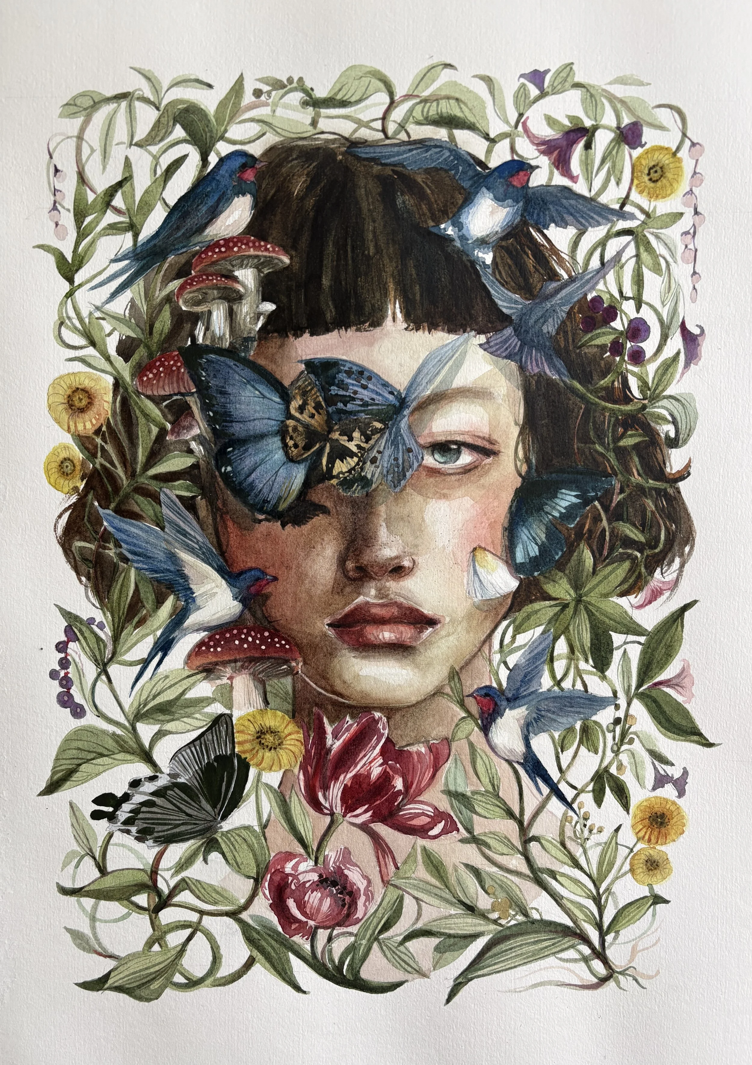 Mi práctica se centra en la acuarela y el óleo como lenguajes expresivos principales. Mis pinturas exploran la conexión entre la naturaleza y la figura humana, creando composiciones íntimas donde la flora, la fauna y lo onírico se entrelazan en atmósferas delicadas y cargadas de simbolismo.
